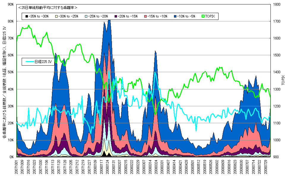 8月4日時点での25日単純移動平均乖離率分布(±側)、TOPIX、日経225 IVです。