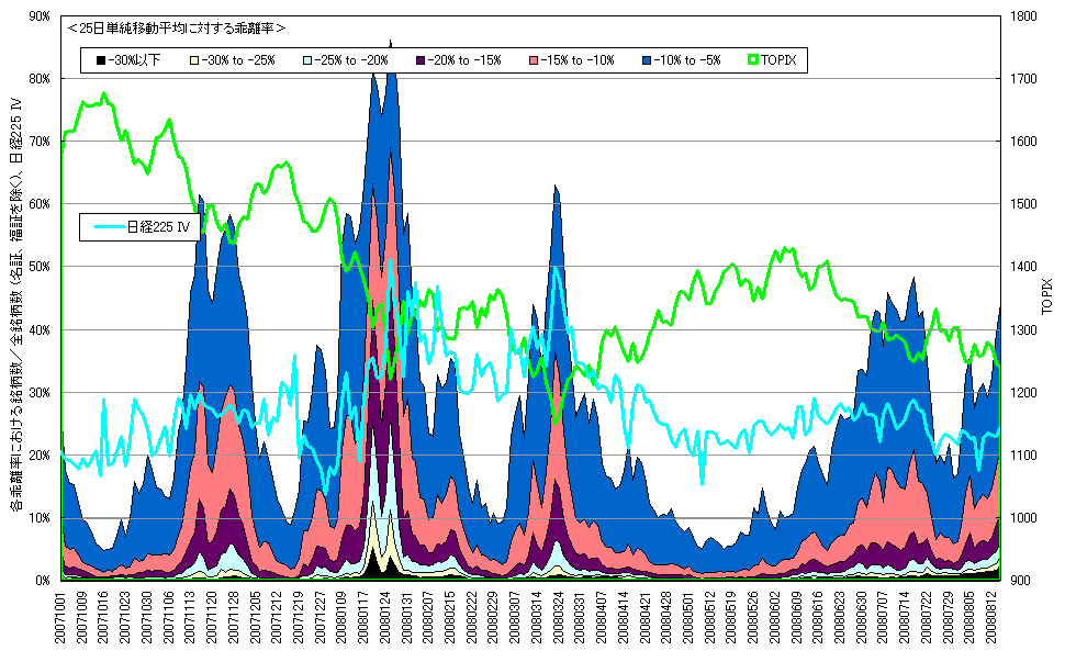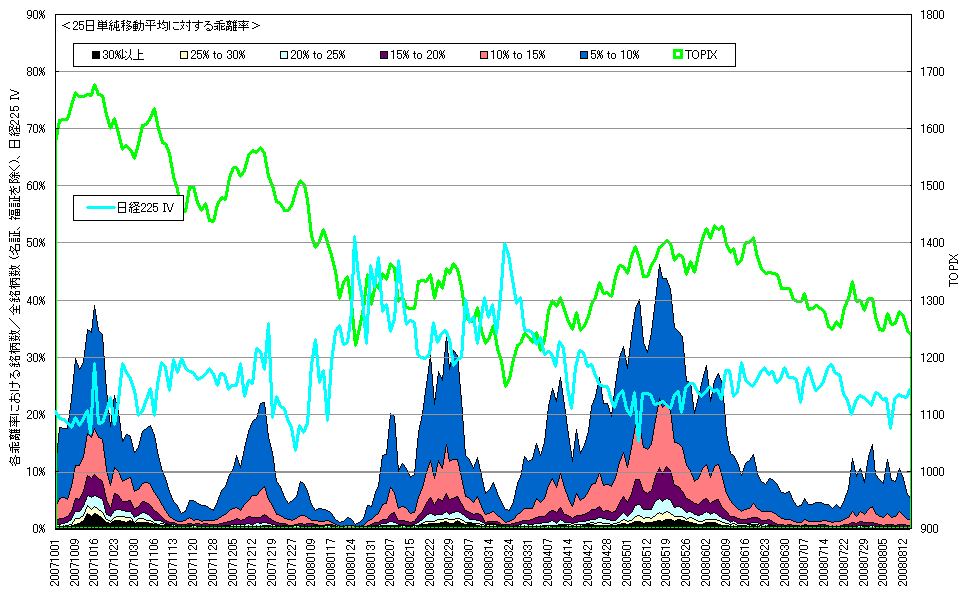 8月14日時点での25日単純移動平均乖離率分布(±側)、TOPIX、日経225 IVです。